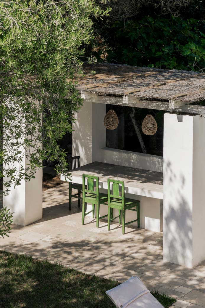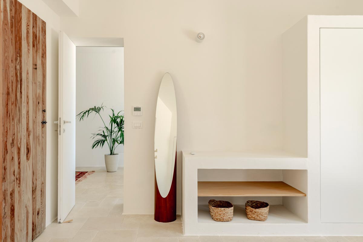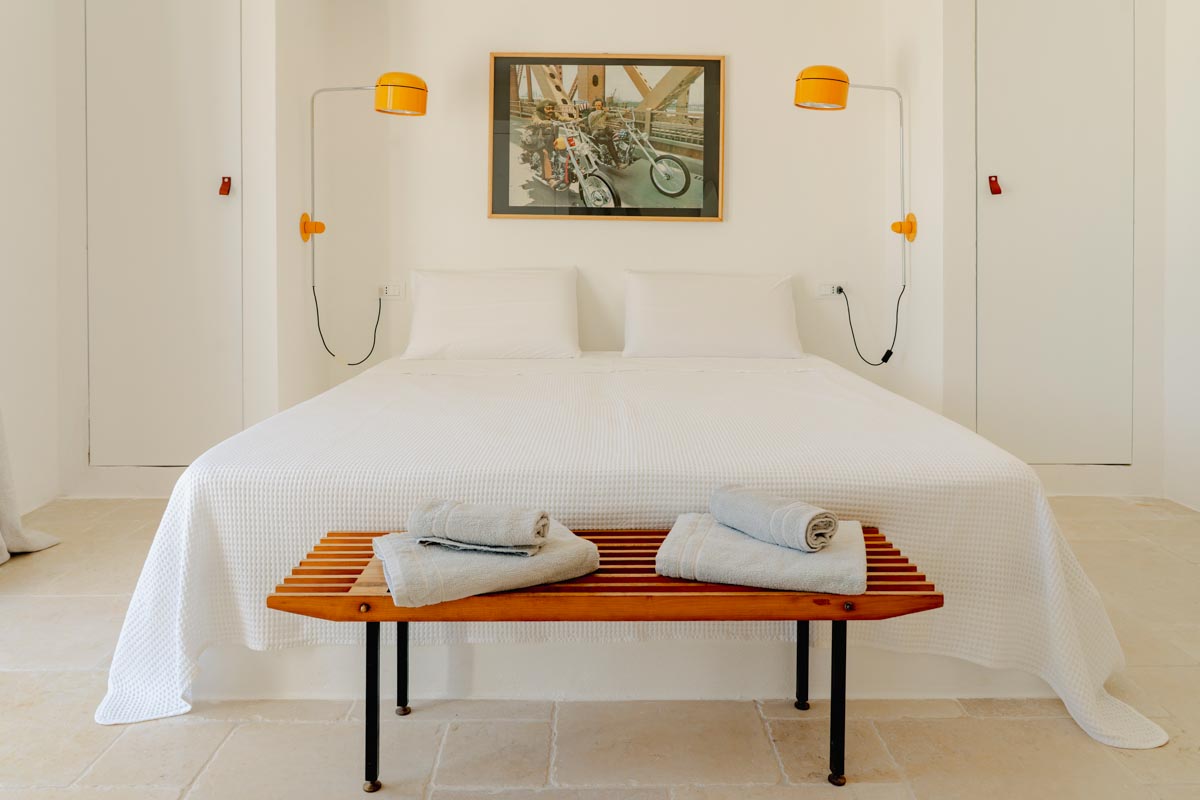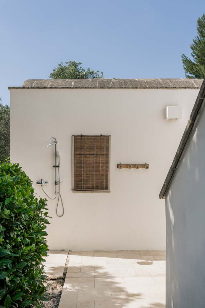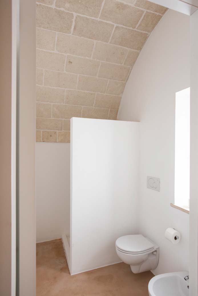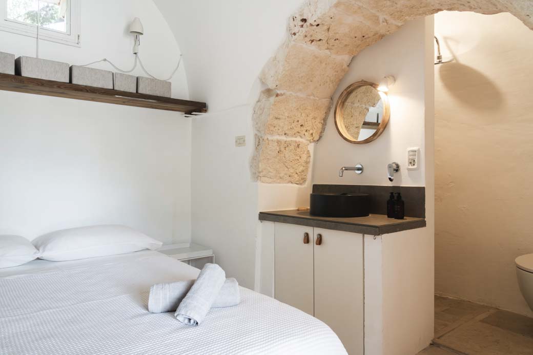 The second building, known as the lamia, features two large bedrooms with double beds, each with its own en-suite bathroom and toilet. One of the bathrooms also includes a washing machine—drying is taken care of naturally by the Puglian sun, between two trees!
