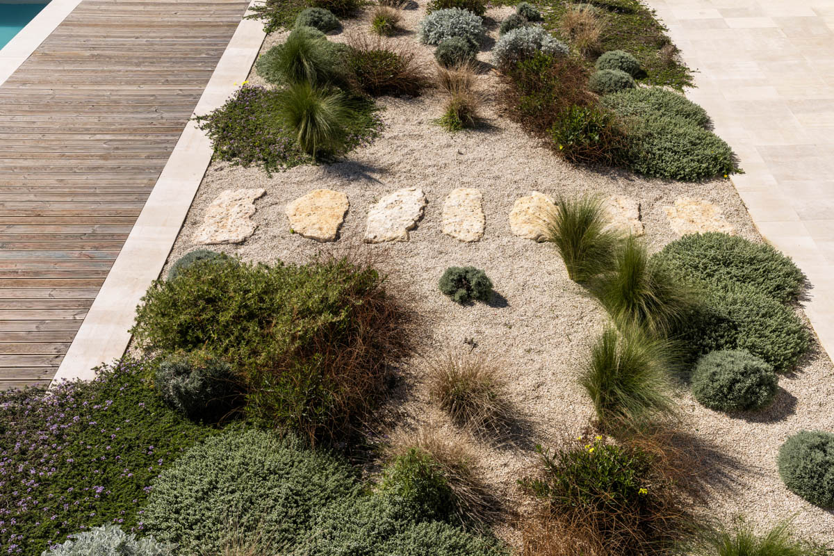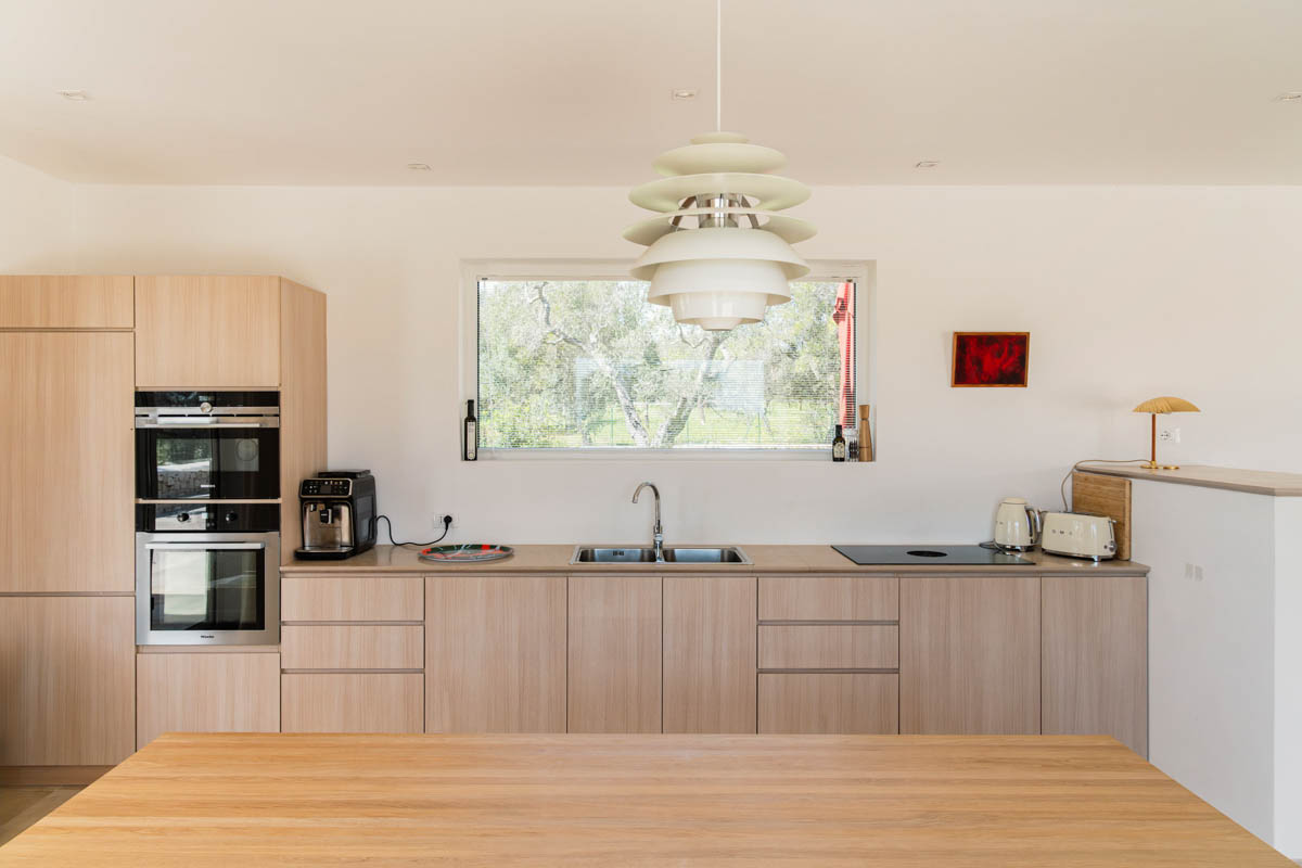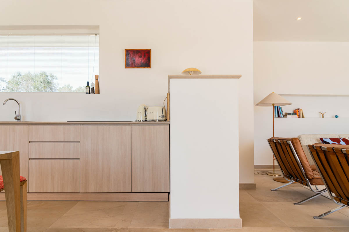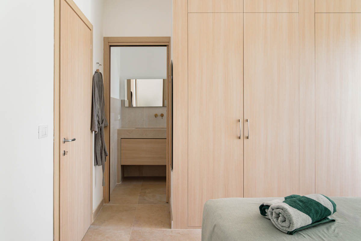 Villa is composed of two buildings. The main house includes two master bedrooms, each with its own en-suite bathroom, a spacious living room with an open kitchen overlooking the garden and pool, and a storage room with a washing machine. The third bedroom is accessed from the outside and features a double bed and an en-suite bathroom.
